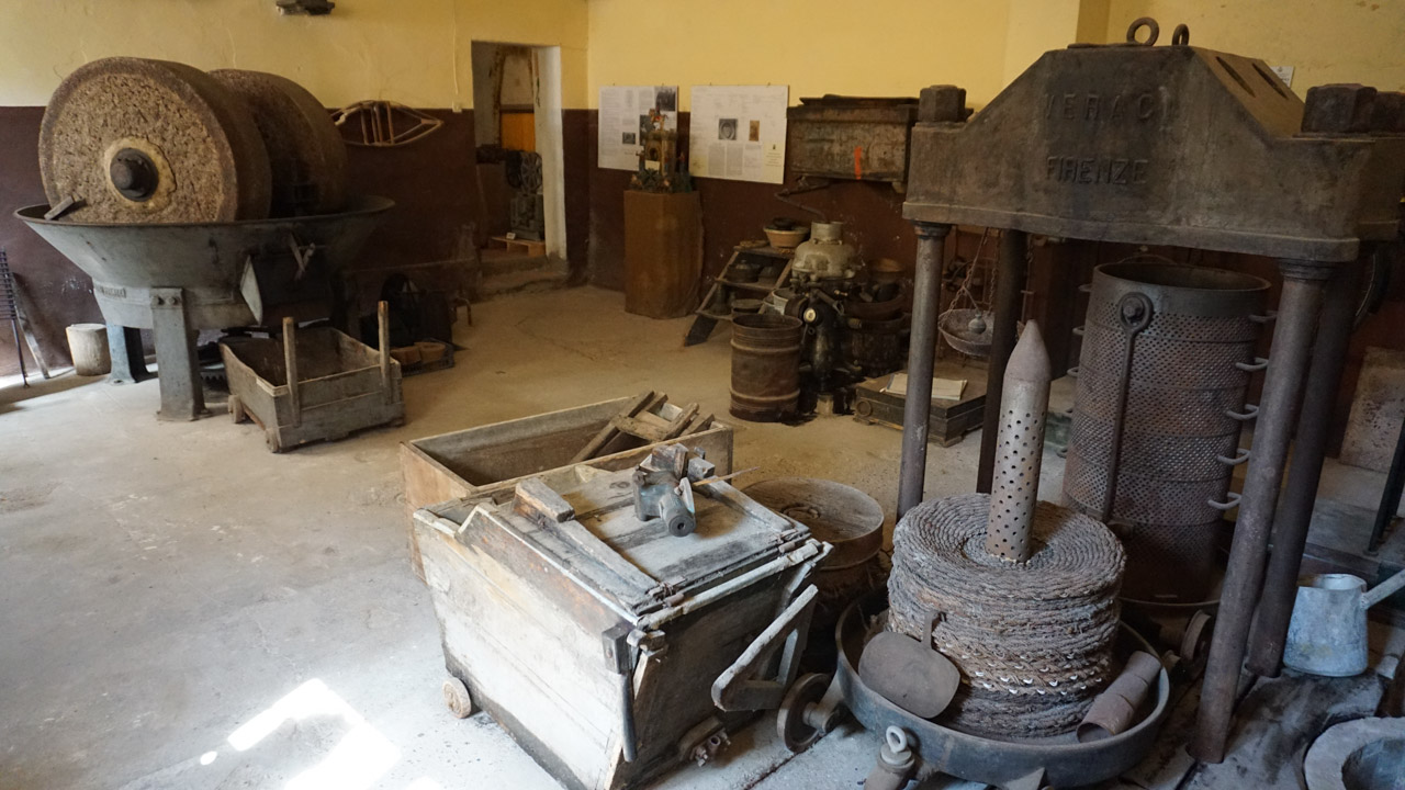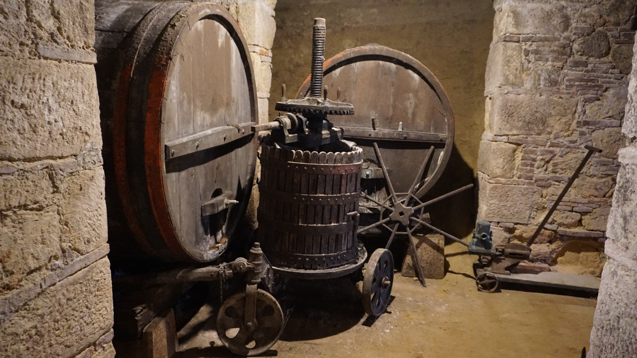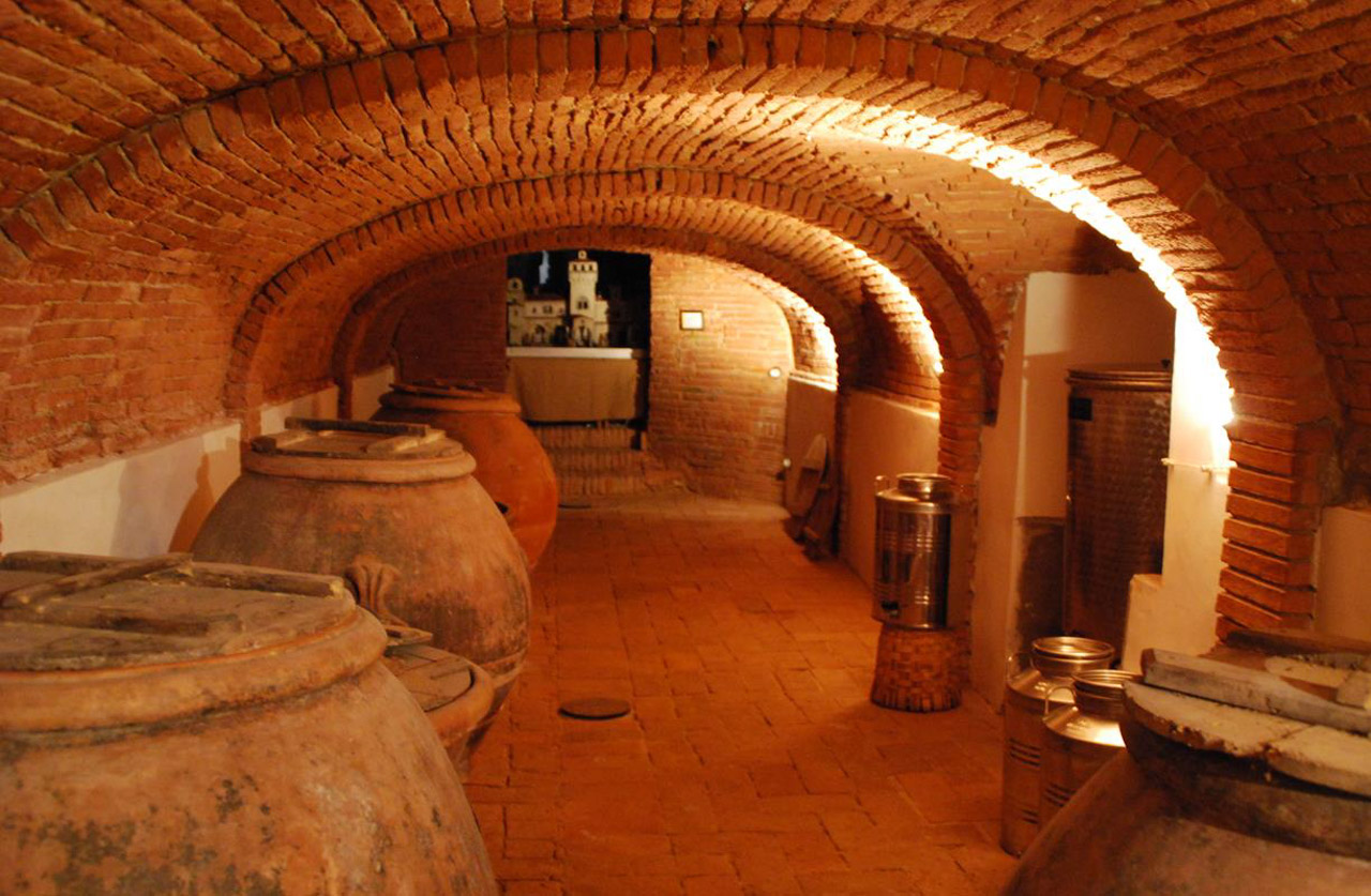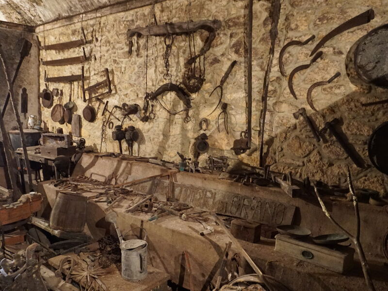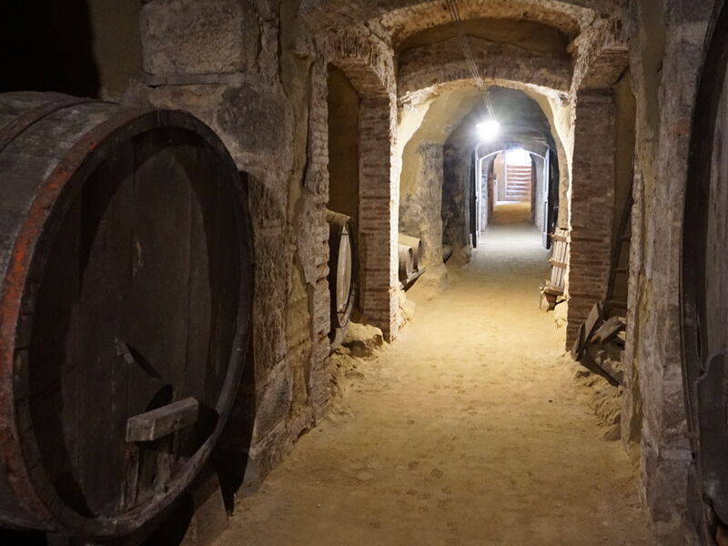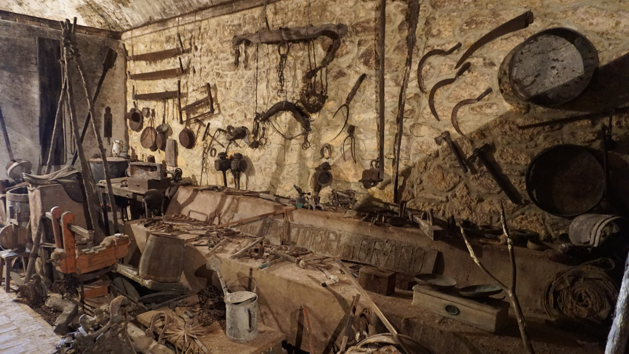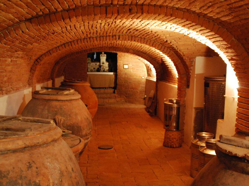 Es gibt einen antiken Weinkeller, der in Tuffstein (na eigentlich ist es gepresster Meeressand, denn ja, hier war das Meer vor 5 Millionen Jahren) gehauen wurde. Er hat verwinkelte Gänge und Nischen, die in einen imposanten Raum übergehen und das landwirtschaftliche Museum beherbergen.