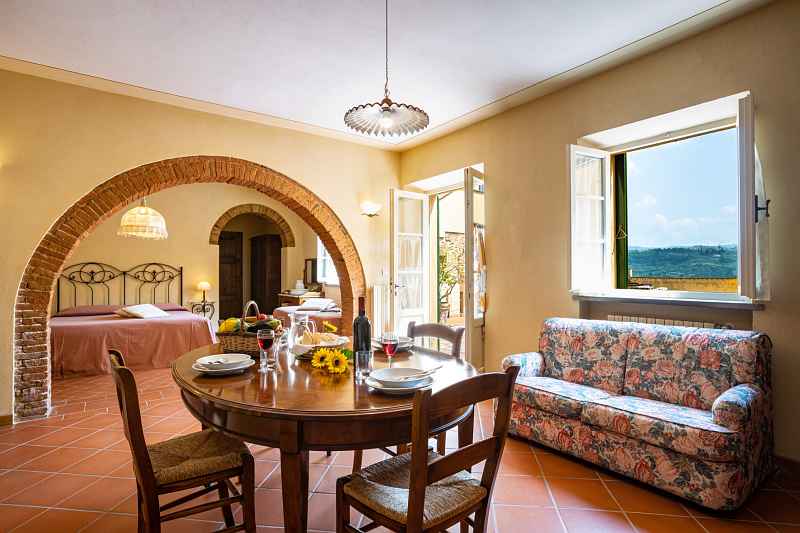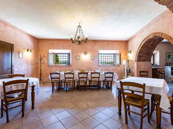 Vor dem Haus beginnen gleich Olivenhaine und Weinberge. Die Aussicht auf Pinien, Zypressen und die weiten Felder von den zwei großen Terrassen vorm Haus ist fantastisch. Dort kann man essen, sitzen und lesen und die Seele baumeln lassen. Angebot von Frühstück und Abendessen, manchmal Pizza backen im Holzofen. Bezug von hauseigenem Wein, Grappa und Olivenöl gern möglich.