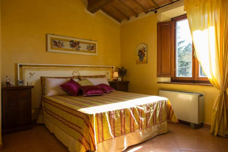 Die Ferienwohnung „Ciliegia“ (deutsch Kirsche) liegt im 1. Stock des gelben Landhauses (zum Agriturismo gehören zwei Bauernhäuser) und hat somit eine gute Privatsphäre. Sie ist 50 m² groß und mit Holzbalkendecken im typisch toskanischen Stil eingerichtet. Sie verfügt über ein Schlafzimmer und einen Wohnbereich/ Küche mit komfortabler Schlafcouch. Man blickt vom Balkon in den Garten, auf den Pool und den Hügel wo Lari mit seinem imposanten Castello liegt, das man auf einem kurzen Spaziergang bequem erreicht. Das Castello kann man auch besichtigen, ebenso wie die kleine aber weltberühmte Nudelfabrik Martelli, die am Fuße des Castellos liegt. Im diesem toskanischen Agriturismo kann man wunderbar essen. Die Familie kocht selbst und bemüht sich tagein tagaus um das Wohl ihrer Gäste.
