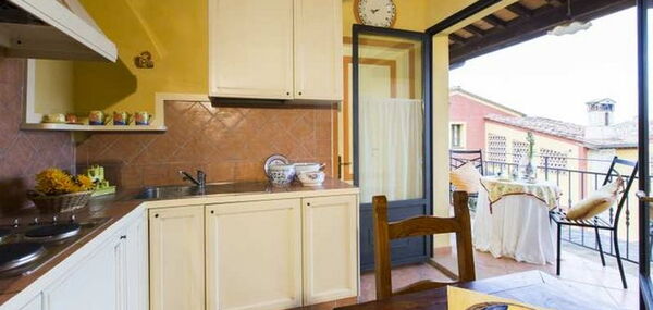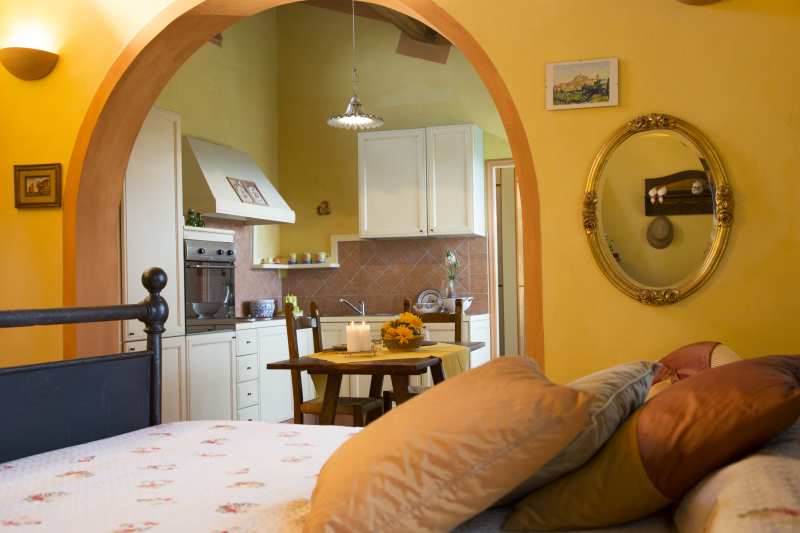 Das Apartment „Melagrano“, Granatapfel, liegt neben dem Apartment Ciliega im ersten Stock eines gelben Landhauses. Es ist eine sehr hübsche Ferienwohnung im Stil "open space", ca. 40 m², mit einem großen Raum mit Doppelbett, Küchenzeile und Balkon mit sehr schöner Aussicht in die toskanischen Hügel nach Lari.