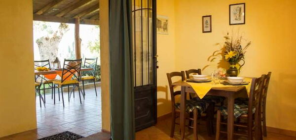 Die Ferienwohnung Mela (50 m²) besitzt einen Schlafraum, eine Doppelschlafcouch im Wohnraum, dazu Küche, Bad und eine eigene Terrasse.
