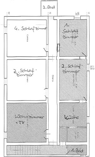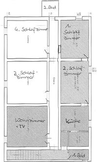 Die 2 + 2 Doppelzimmer sind auch als Dreibettzimmer nutzbar. Im Wohnraum gibt es eine weitere Schlafcouch und SAT-TV. Das Haus verfügt über zwei Bäder und eine Wohnküche.