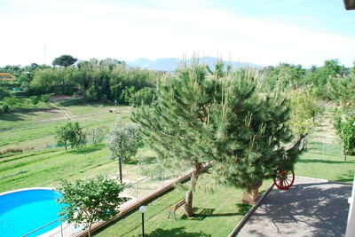 Liegen, Stühle, ein Tisch, der wichtige Sonnenschirm, eine Dusche (solarwarm) und der runde Pool, aus dem man einen herrlichen Blick über die Landschaft bis hin zu den Bergen hat, sorgten für den passenden Rahmen an den Tagen, an denen wir nicht die Märkte der Region leerkauften!